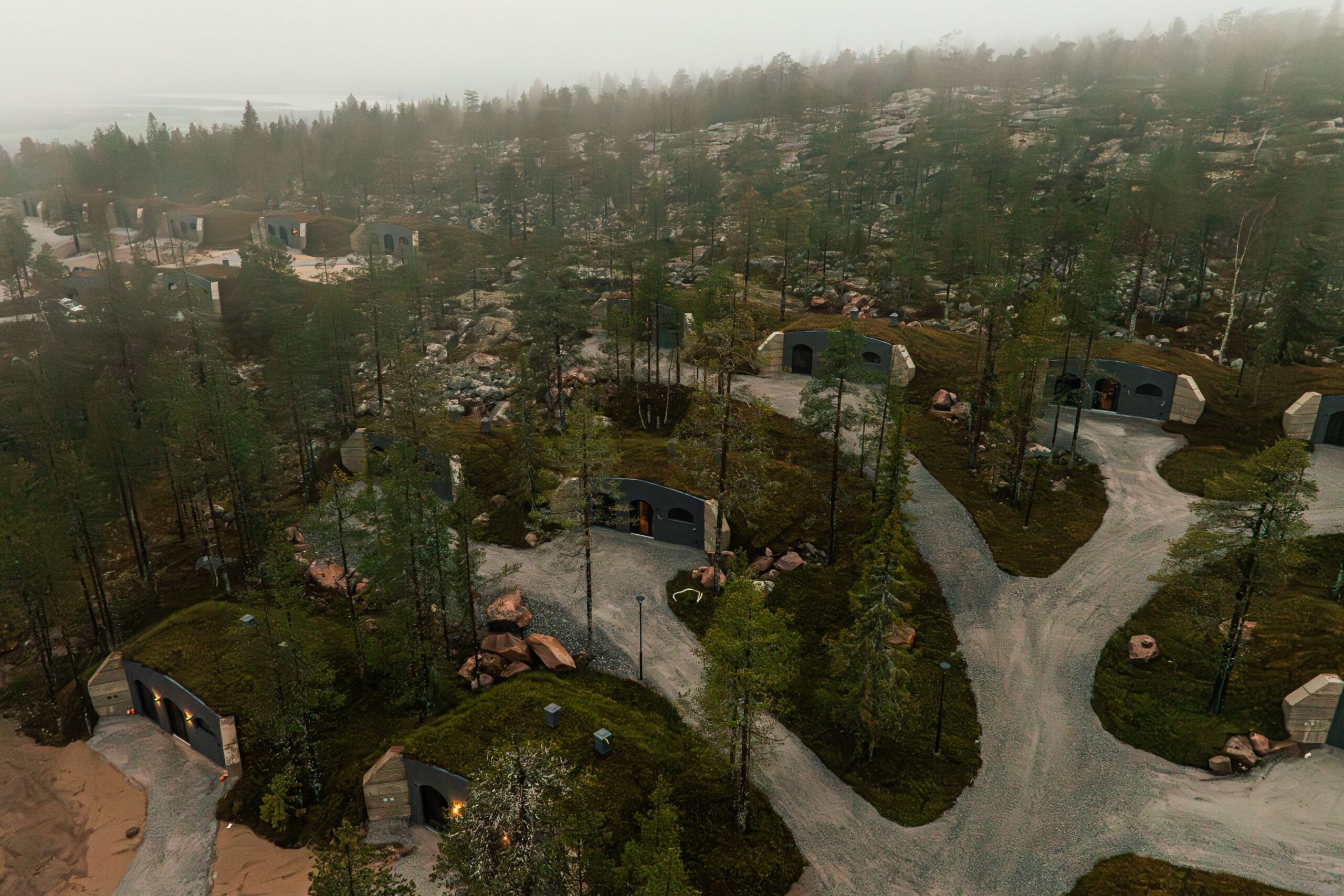 In Finnish Lapland, where winter tourism has traditionally revolved around timber chalets and glass-roofed cabins, a new development is taking a markedly different architectural approach; Kaamos Lodge, which has now opened to guests, consists of 80 underground concrete modular homes manufactured in Estonia by the Harju County–based company Revonia.