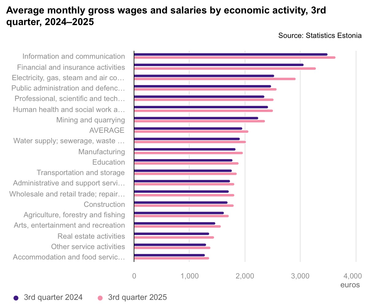 “As in previous years, information and communication led the earnings table in the third quarter, with average gross wages of €3,646,” Saagpakk noted. “Financial and insurance activities followed at €3,288, while electricity, gas, steam and air-conditioning supply reached €2,929.”