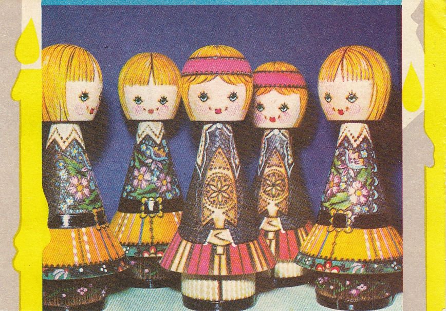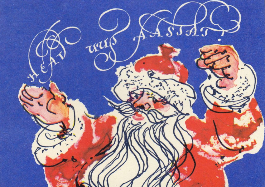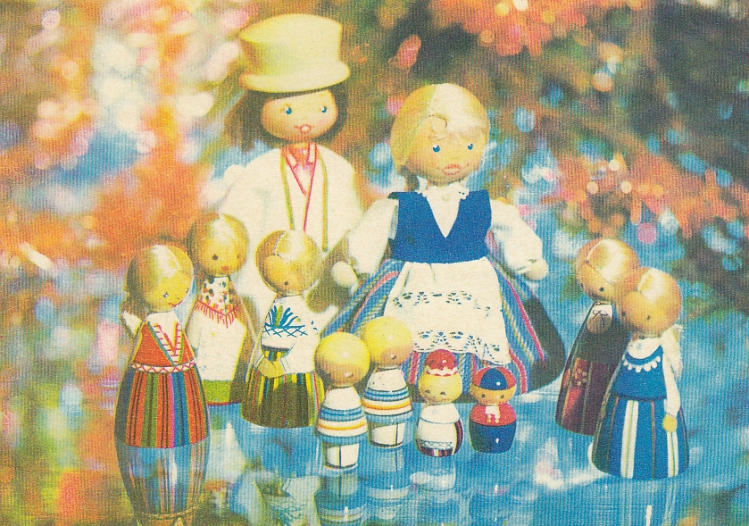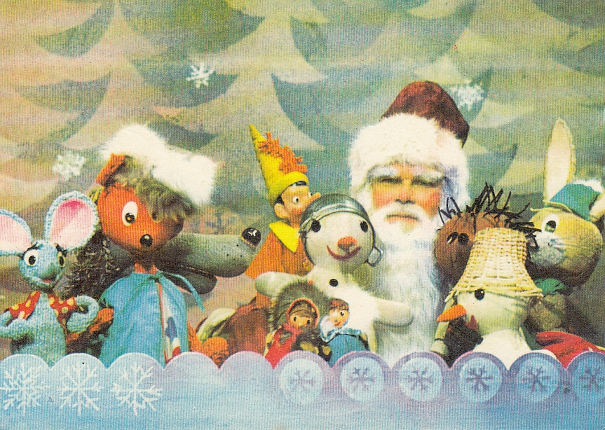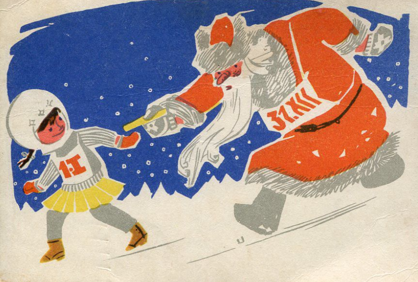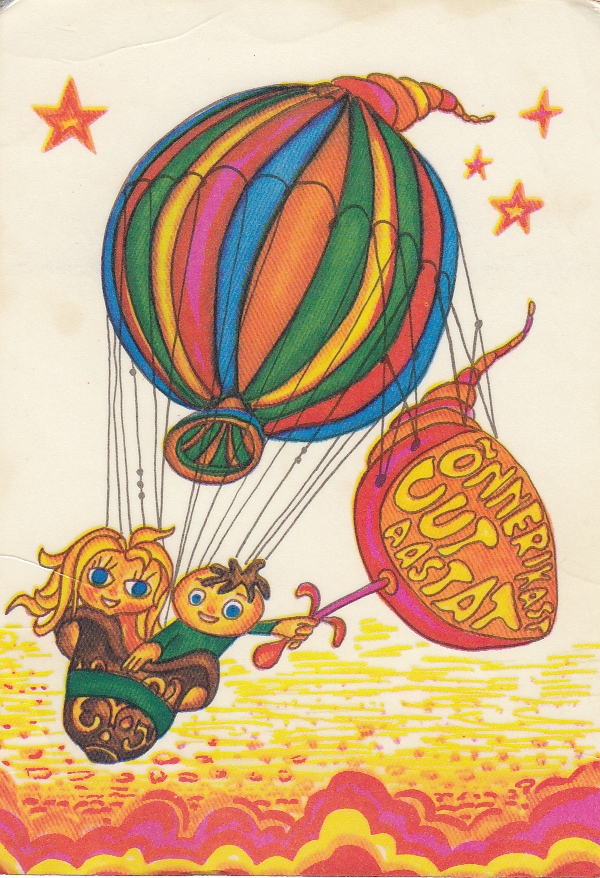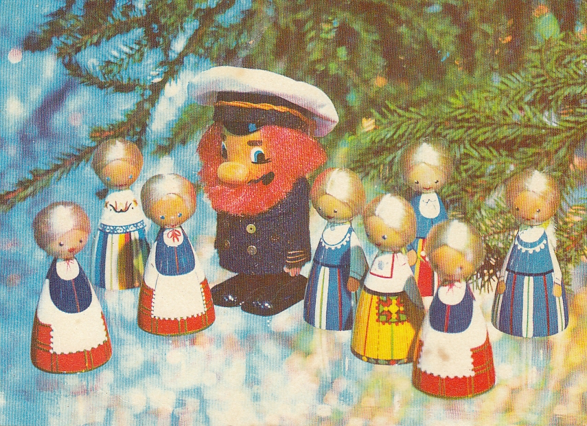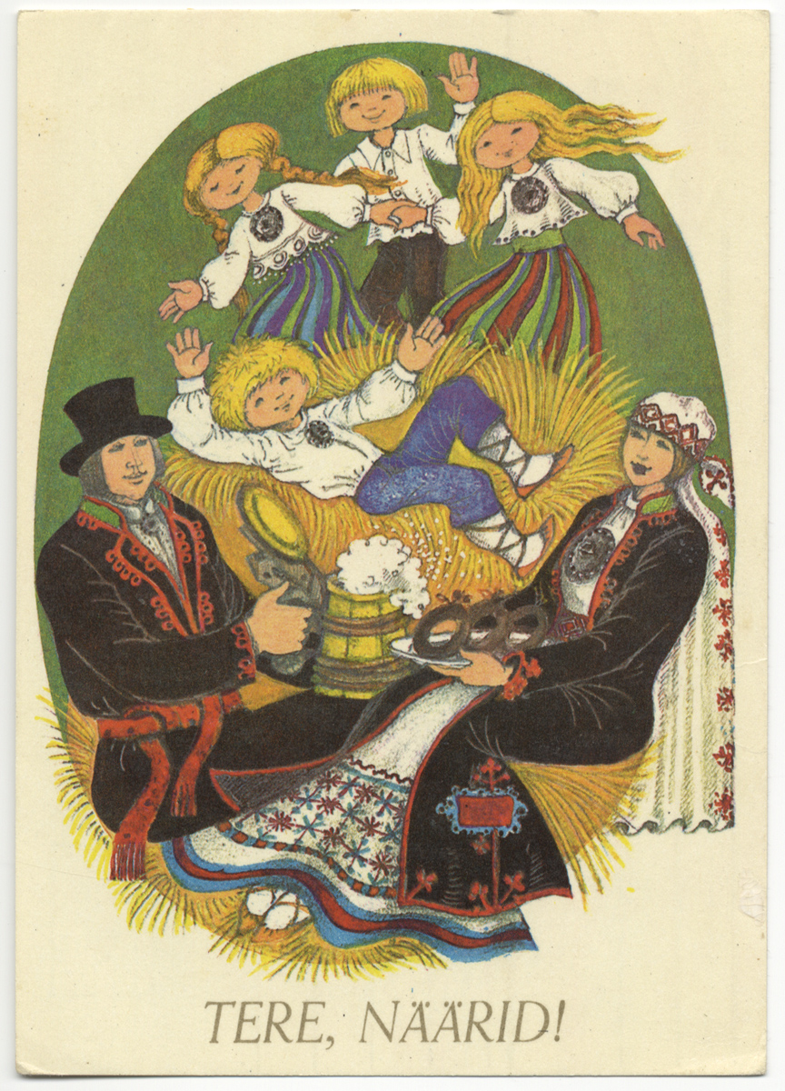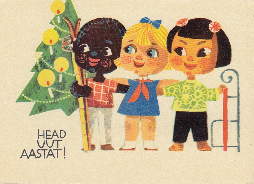 A Soviet-era Estonian New Year’s card from the 1970s. The characters’ eye colours reflect Estonia’s national tricolour, illustrating how artists embedded subtle markers of identity under Soviet occupation.