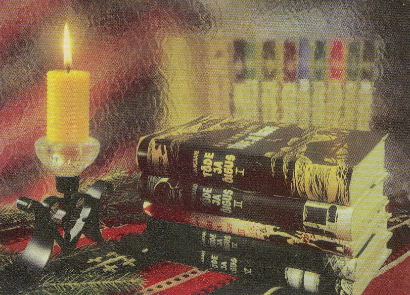 Within strict ideological limits, however, Estonian designers showed quiet ingenuity. Snowy landscapes, spruce branches, candles, children’s characters, winter games and traditional food took centre stage. Literature slipped in too – including works by Anton Hansen Tammsaare, whose Truth and Justice appeared on cards officially intended to mark the New Year. Some designs edged into unintended absurdity: postcards featuring tractor manuals or metalworking guides, solemnly reframed as festive greetings.